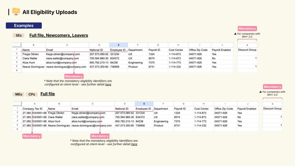 | National ID | Mandatory if Employee ID + National ID as eligibility identifiers (Email as optional) | It must be unique for the same company tax id; at the multi-entity and channel partner-level, duplicates are accepted | It’s an alphanumeric field, and its validation depends on the company's country - it refers to the employees tax id (e.g. in Brazil CPFs are requested). Format and logical validations are performed | 11122233396 AB1234FA43 |