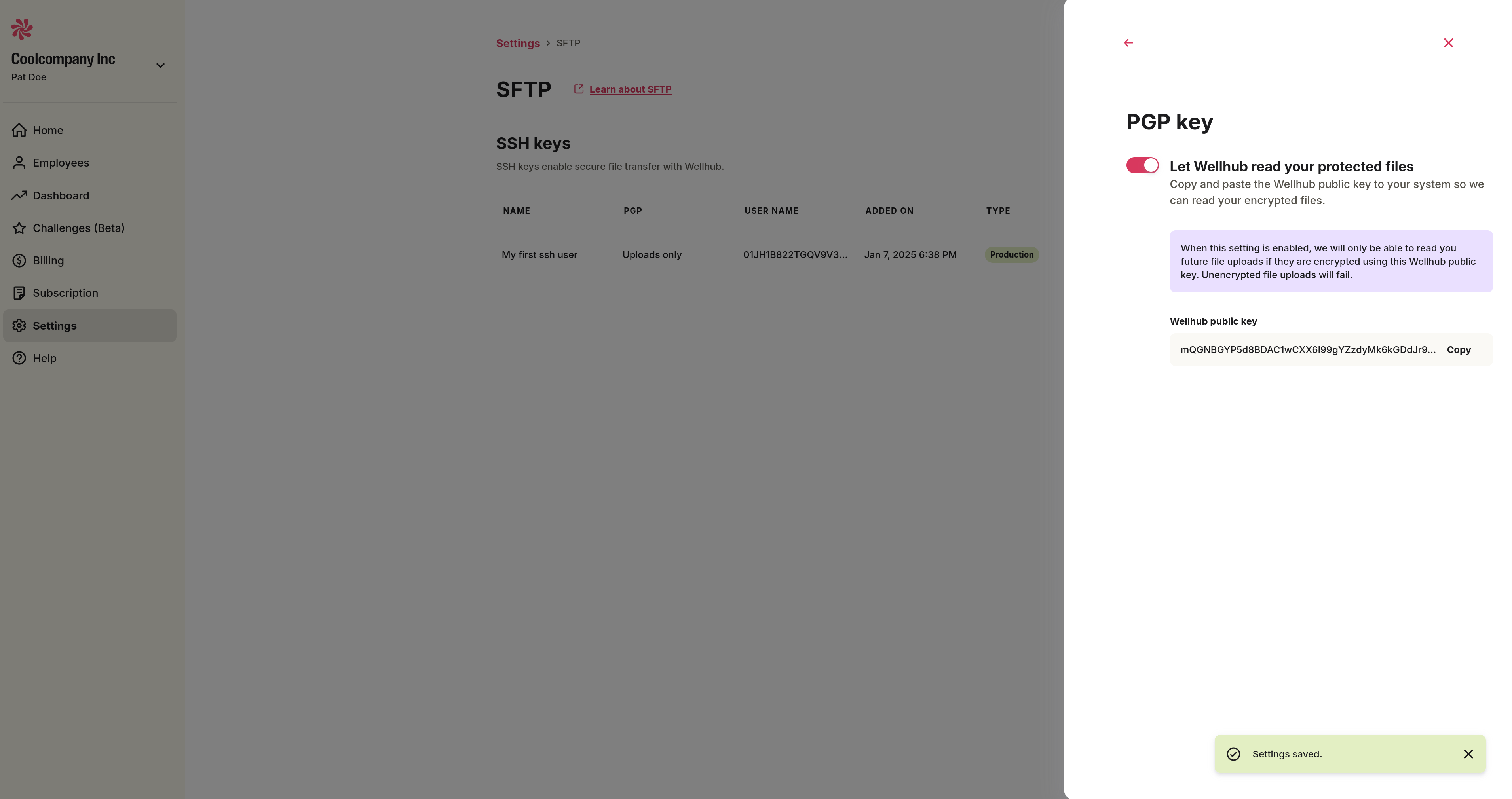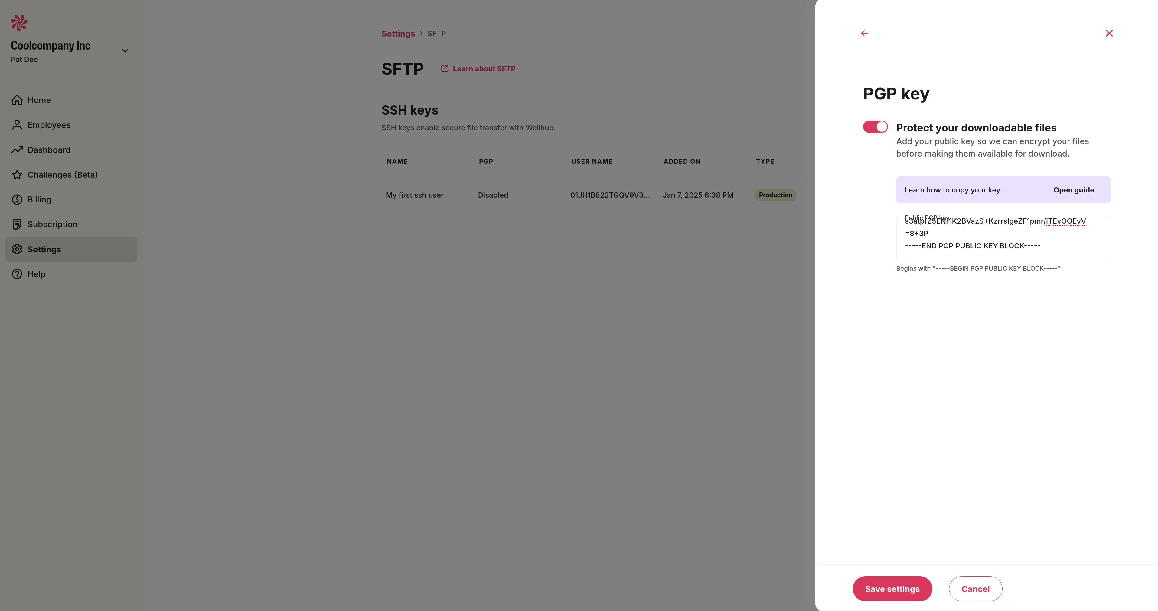 In the drawer that opens, select "Receive encrypted files from Wellhub," enable the toggle, and paste your public key in the appropriate field.